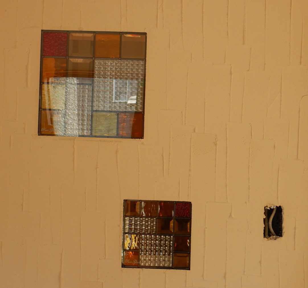 ステンドグラスの持つ色合いと光沢との調和、くわえて平滑で工業製品然としたステンドグラスに対しての有機的な引き立て役のランダムなジョリパット塗り。(写真が少し傾いていますね・・・後ほど修正を。)