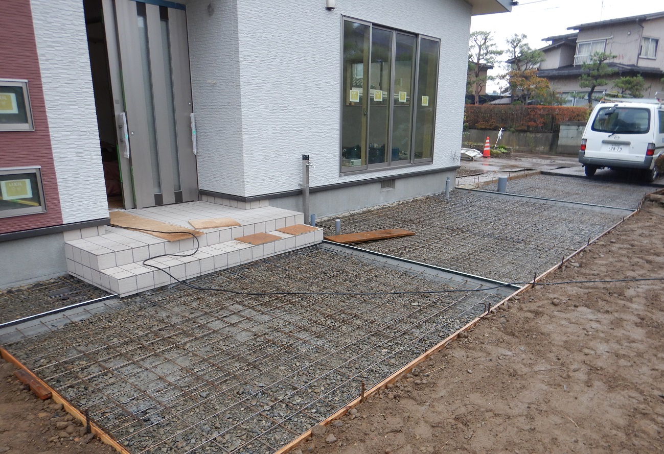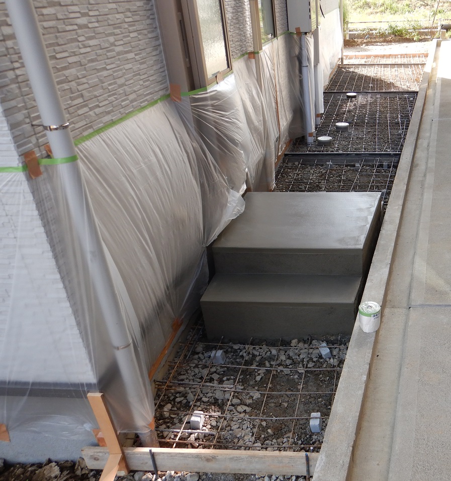 外部では土間コンクリートの打設準備(伸縮目地・ワイヤーメッシュ・アンカー打ち)等の施工を終え、月曜日10/15の土間の打設を待つばかりとなりました。勝手口の踏み階段も、土間コンクリートを待ちわびているようです。