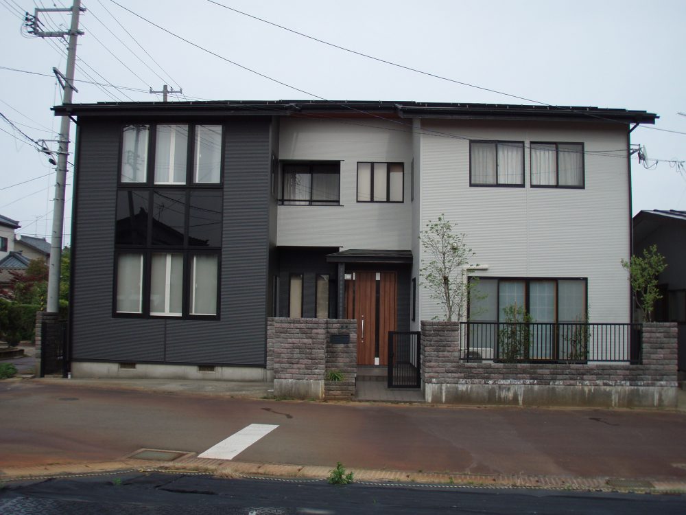正面のアクセントには金属サイディングと木製羽目板の異種部材を用い、それら取り合いにつきましても、入念な検討と施工管理を行っております。