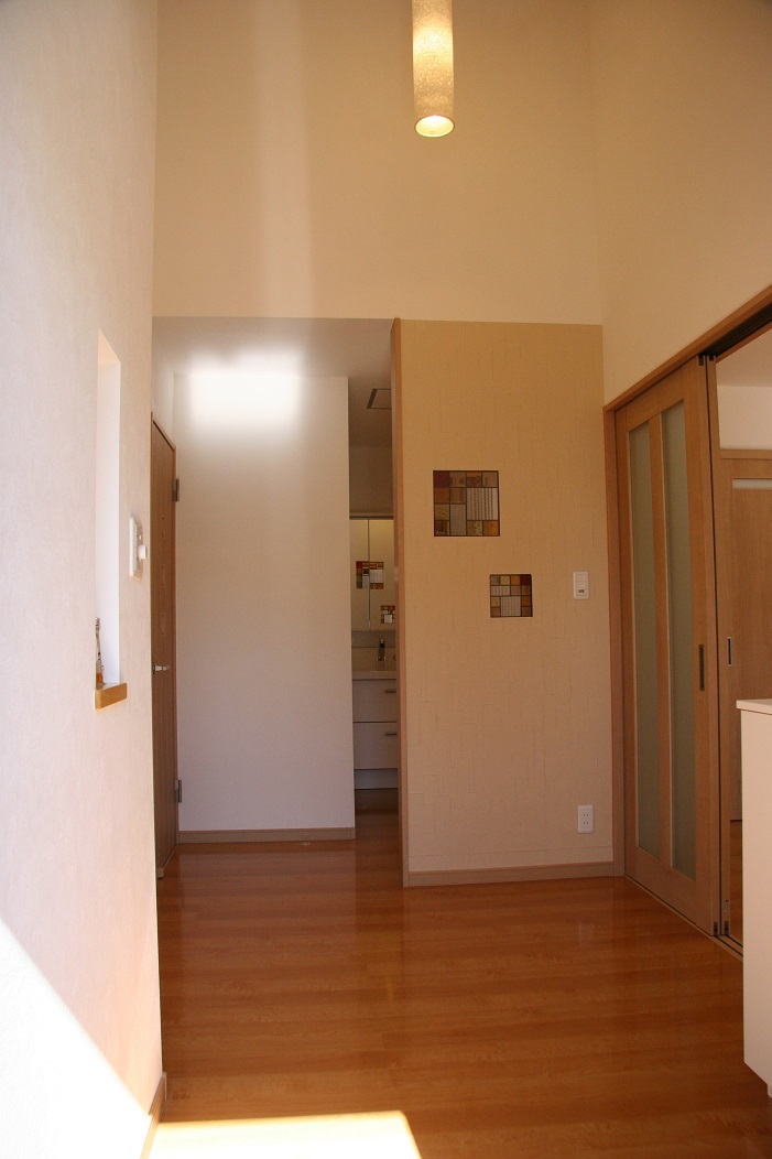 玄関ホール:吹抜天井とニッチ、奥の洗面室の隔て壁としてデザインした、ステンドグラスを埋め込んだジョリパットの淡いオレンジ色が、次の写真、シューズクロークのビビットカラーのオレンジドアと呼応します。
