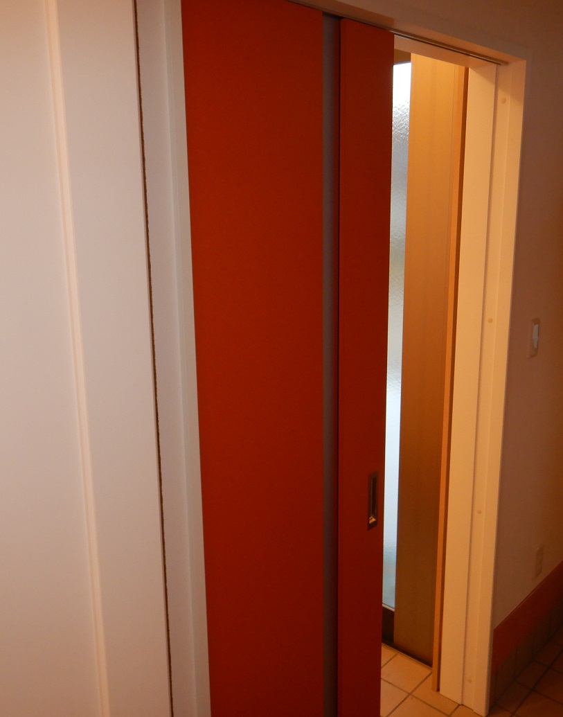 写真はきれてしまっていますが、雰囲気はお伝えすることが出来ると思います。このドアの色合いが、前述のステンドグラス飾り壁と呼応致します。