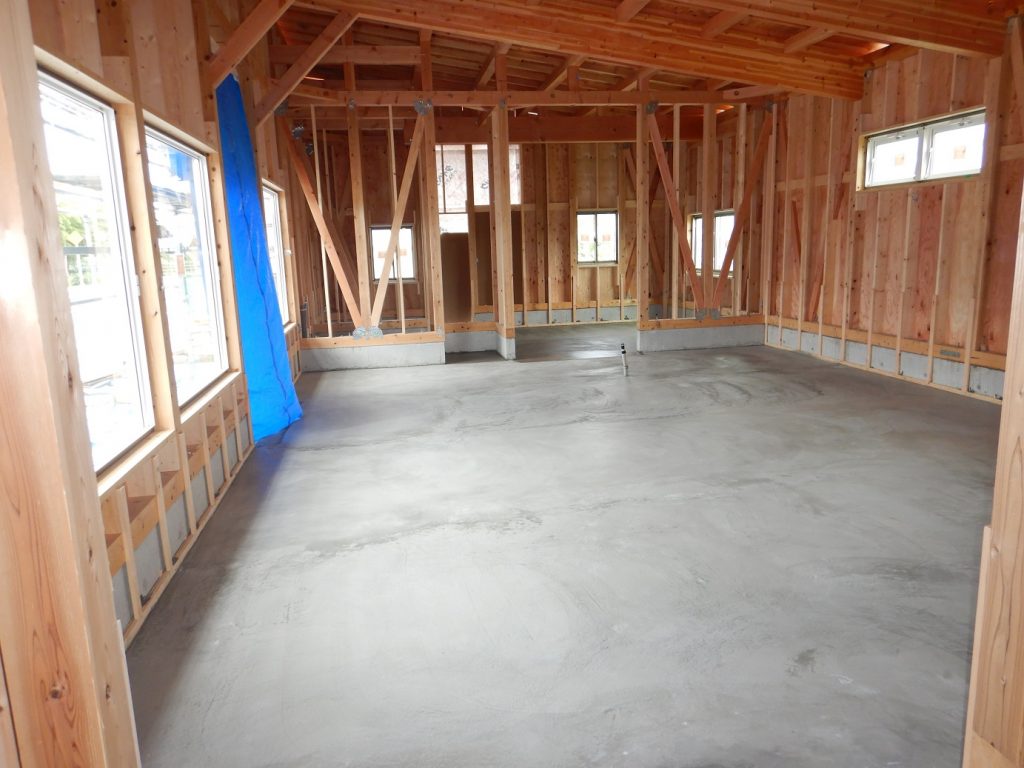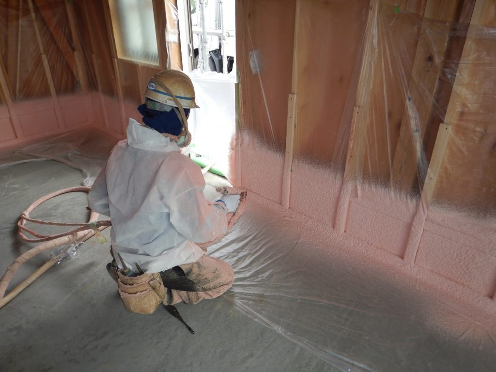 床の養生期間を経て、本日、腰壁部分の現場発泡ウレタン吹き付けを完了致しました。