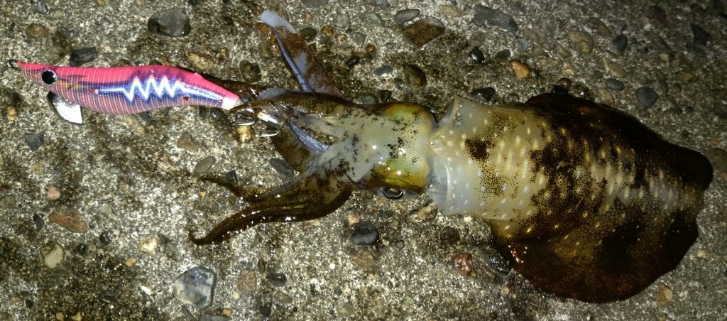 おかげで一匹の、アオリイカが釣れました。
