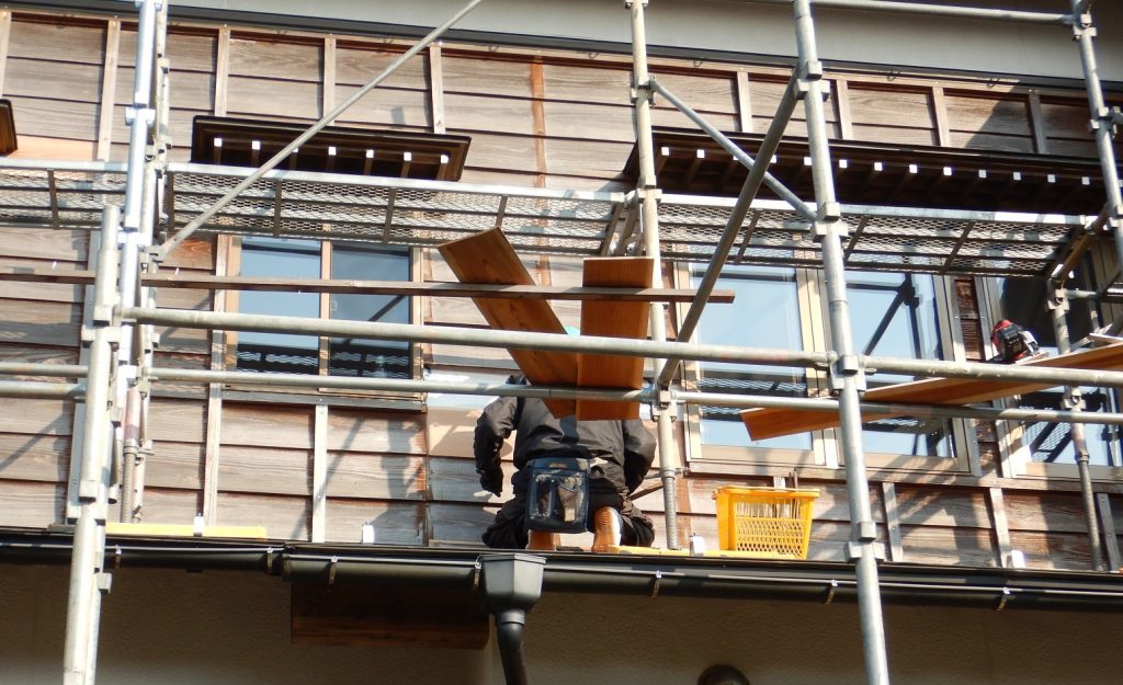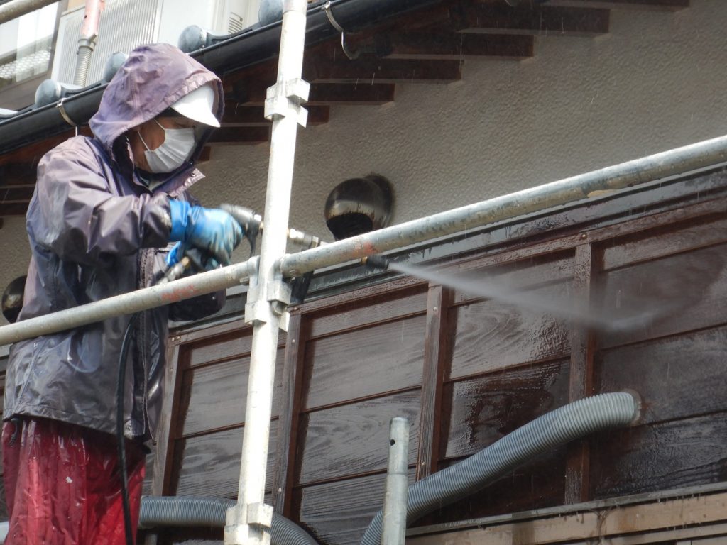 雨板(羽目板)の塗装改修といえば、当然塗装前の素地ごしらえ、高圧洗浄はもちろんのこと、建物の方位によっては極端にその雨板(羽目板)そのものが劣化しているケースが往々にございますが、そこを丁寧に復元改修致します。その完了を確認したうえで、塗装本工事に入る訳です。