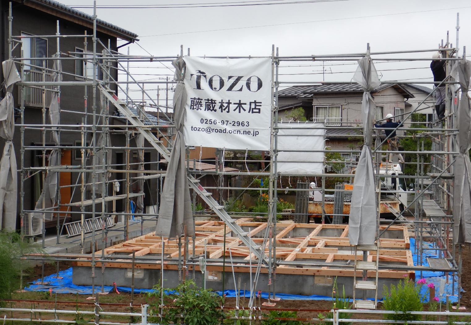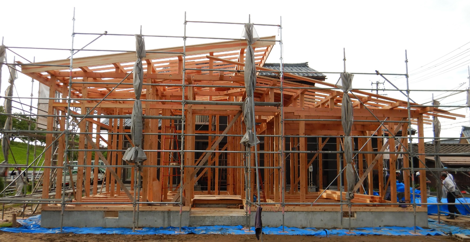 7月8日の建前に向け、土台敷き及び外部足場組立作業が完了いたしました。